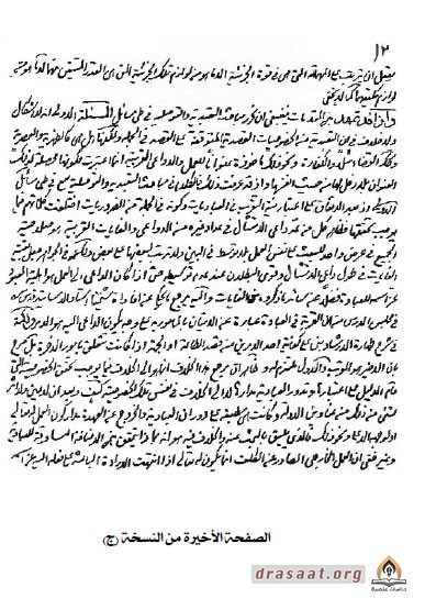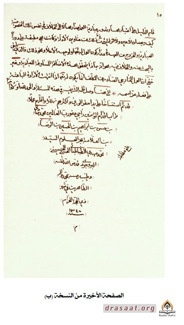 (٩١) في (ب): (إلى هنا وصل قلمه الشريف في هذه المسألة والحمد لله أولاً وآخراً قد تم استنساخا على يد أحقر الورى وأكثرهم زللاً وأقلهم عملاً تراب أقدام المؤمنين راجي عفو رب العالمين محمد صادق بن حسن بن إبراهيم بن الحسين بن الرضا ابن العلامة بحر العلوم السيد محمد مهدي الطباطبائي الحسني الحسيني البروجردي قدس الله نفسه وطيب رمسه