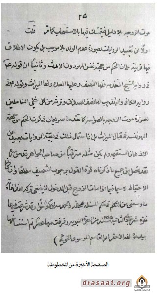 وآخرها: (هذا غاية ما وسعني من التكلم في حكم المسألة عجالة, والحمد لله أولاً وآخراً, وقد شرعت فيها غرَّة جمادى الثانية سنة ١٣٥٥ من الهجرة النبويّة, وقد فرغت منها عصراً).