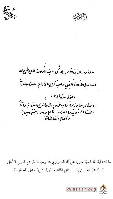 وهذا الكرّاس انتقل بعد وفاته إلى ملك ولده المرحوم حجّة الإسلام والمسلمين السيّد ميرزا حسن الشيرازي طاب ثراه، ولمّا ارتحل إلى الرفيق الأعلى اشتراه من ورثته وصيّه وصهره سيدنا المرجع الديني الأعلى السيّد علي السيستاني T وكتب عليه بخطّه الشريف: